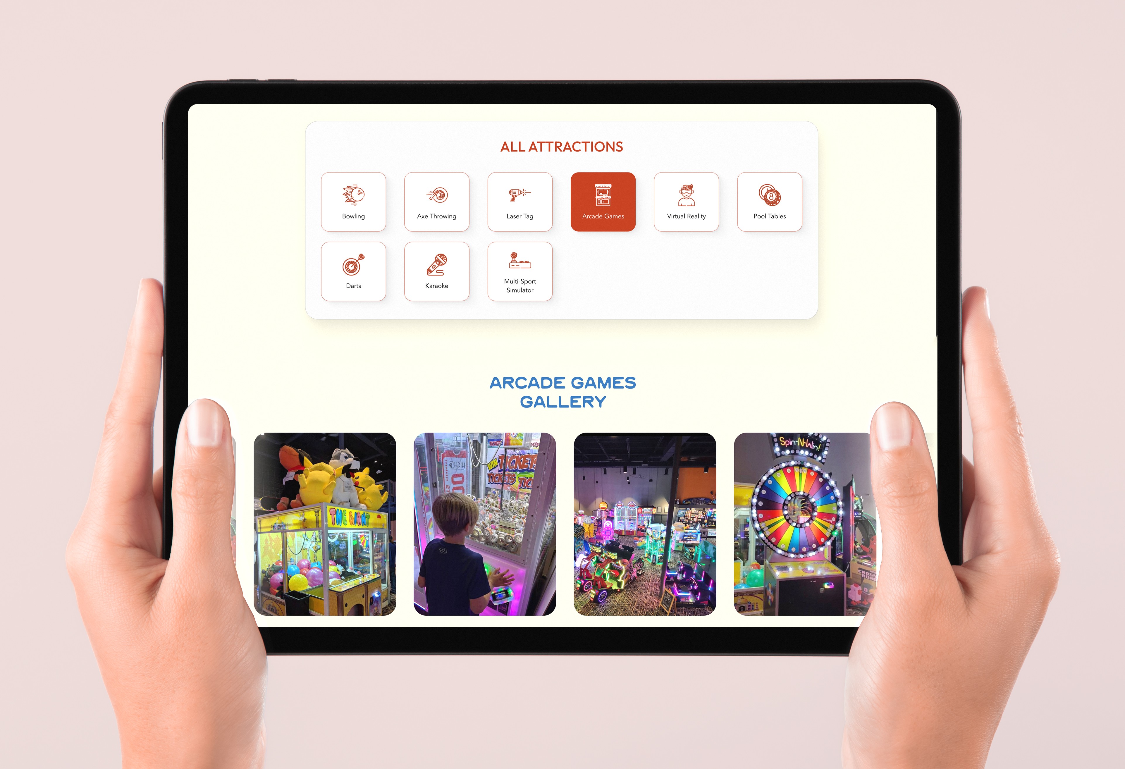 Entertainment venues are hard to design for because the real product is a feeling — and feelings don't translate automatically to web pages. The site needed to feel electric from the first scroll, not just look colourful. On top of that, High 5 Exchange operates multiple locations across Texas, each with its own offering, and a wide range of activities that all needed their own space without the site becoming overwhelming to navigate. There was also a practical challenge — the client didn't have enough photography to cover everything. The website needed to feel visually rich and fully realised from day one, with or without a complete image library.