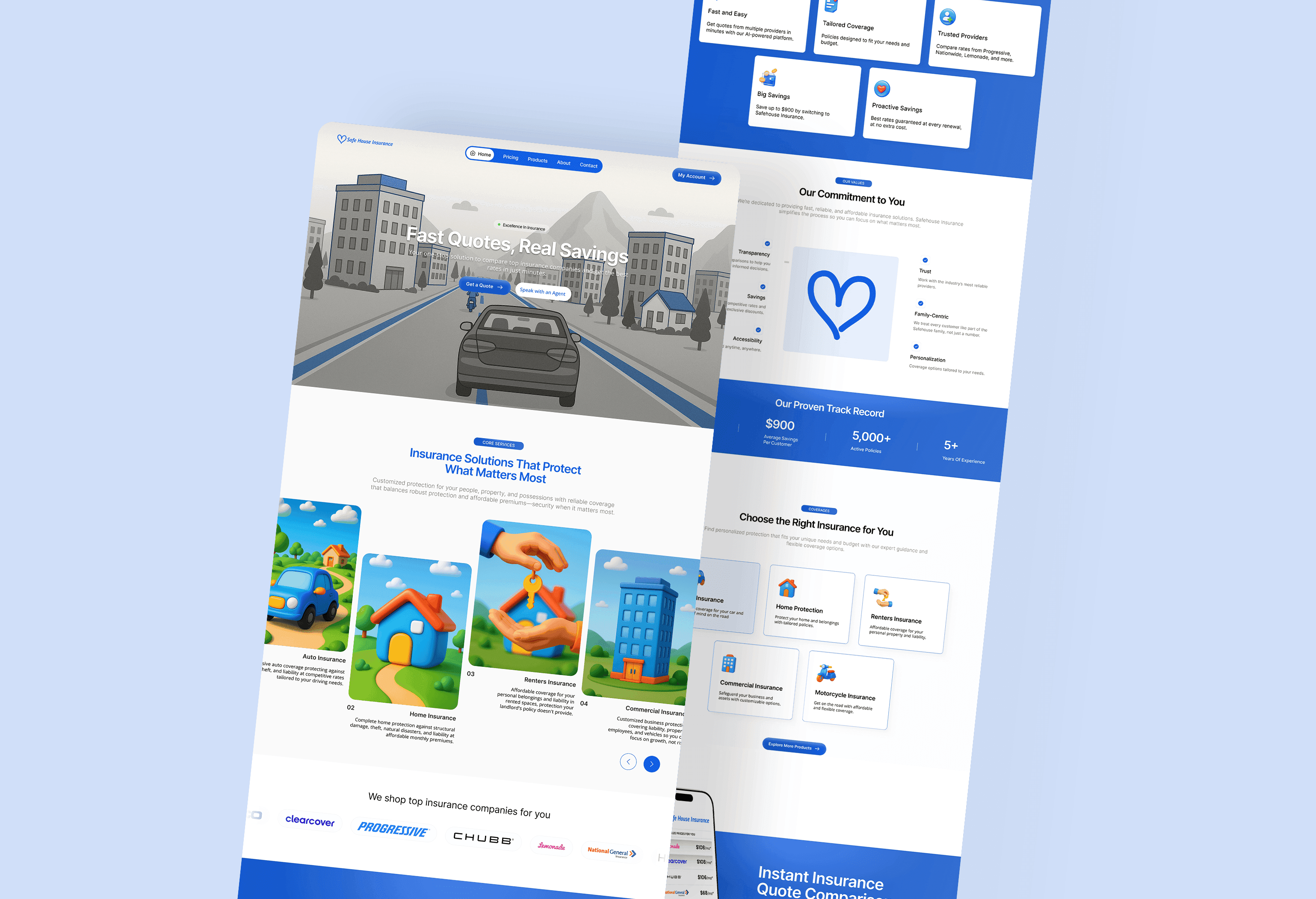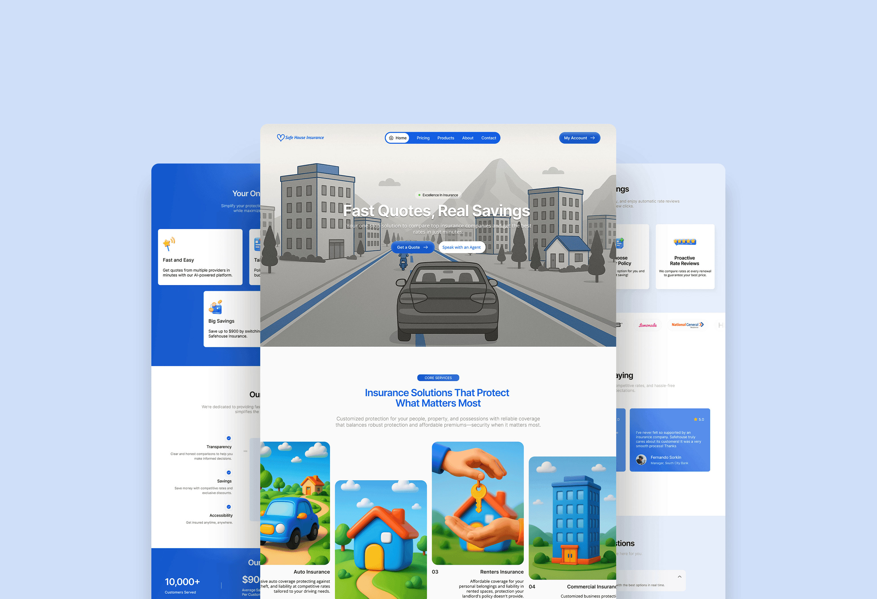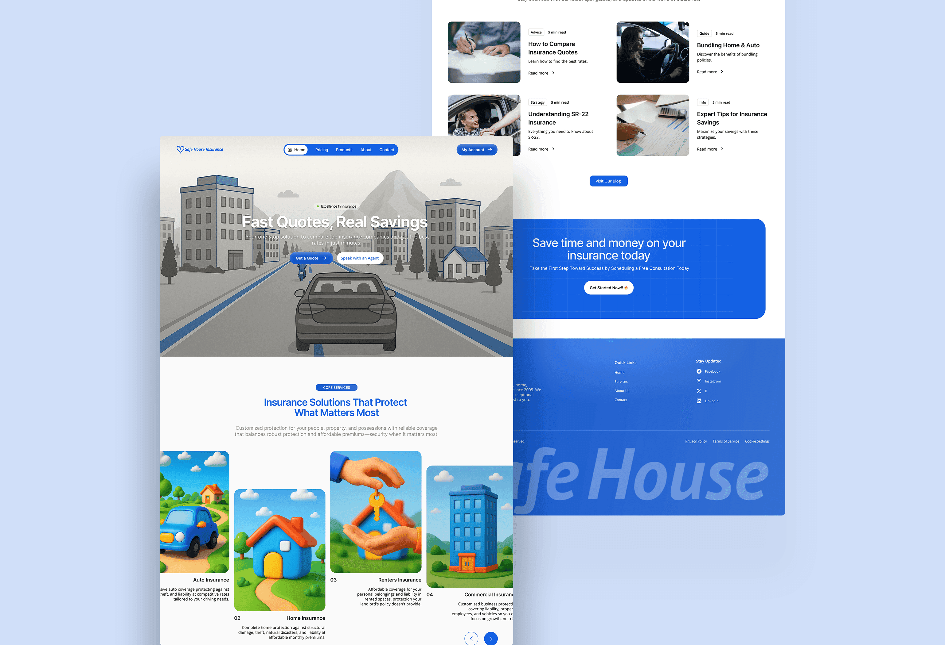 Safe House Insurance approached us with a straightforward but meaningful mission: build a website that helps everyday people understand their insurance options without the usual confusion or frustration. They wanted a clean, trustworthy platform where users could compare quotes, explore coverage types, and get guidance from real agents — all within minutes.